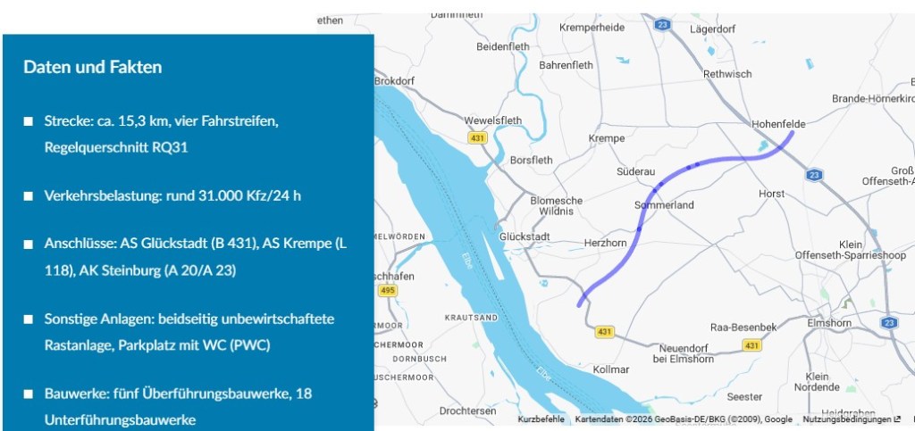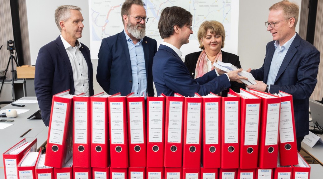 Während für den an Segeberg angrenzenden Abschnitt bis zur A 7 derzeit die Planfeststellungsunterlagen für das Fehlerheilungsverfahren ausliegen, liegt seit wenigen Tagen eine weitere Baugenehmigung vor. Madsen: „Im März werden wir den Planfeststellungsbeschluss für den 15-Kilometer-Abschnitt zwischen Glückstadt an der Elbe und der A 23 im Kreis Steinburg auslegen. Damit ist hoffentlich bald ebenfalls die rechtskräftige Voraussetzung für die Durchbindung der Autobahn nach Niedersachsen geschaffen.“ Mehr dazu hier