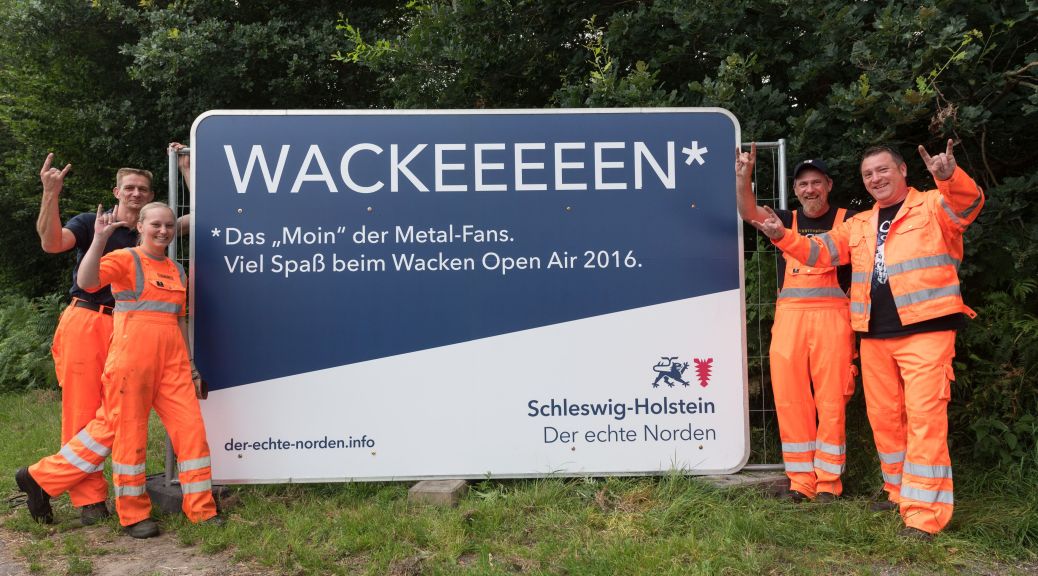 Die Standortmarketing-Kampagne des Landes mit dem Claim „Schleswig-Holstein. Der echte Norden“ greift das Kult-Festival aber nicht nur auf einem Begrüßungsschild auf: So gibt es neben Edgar-Cards mit Sprüchen wie „Zwei Meere. Dazwischen die schönsten Riffs. Der echte Norden wünscht viel Spaß beim Wacken Open Air 2016“ auch online einen Live-Blog geben – und zwar hier: http://der-echte-norden.info