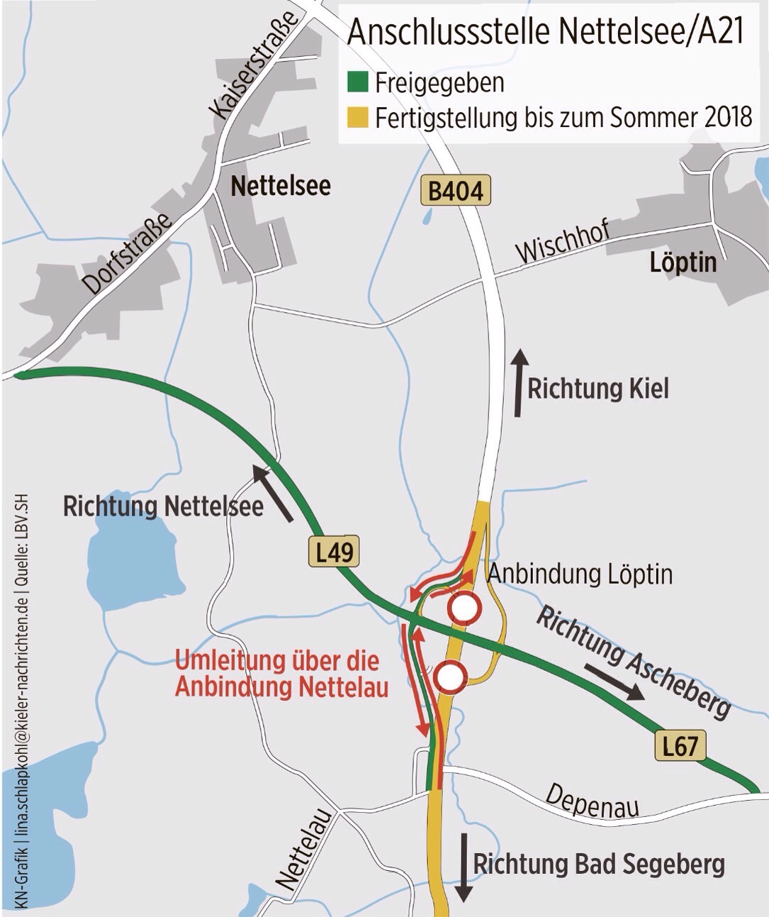Nach den Worten von Matthias Paraknewitz, dem zuständigen Niederlassungsleiter des Landesbetriebs Straßenbau und Verkehr Schleswig-Holstein (LBV-SH), waren für die neue Anschlussstelle in Nettelsee erhebliche Sanierungen des moorigen Untergrunds sowie der Neubau von fünf Brückenbauwerken und ein großes Regenrückhaltebecken nötig.