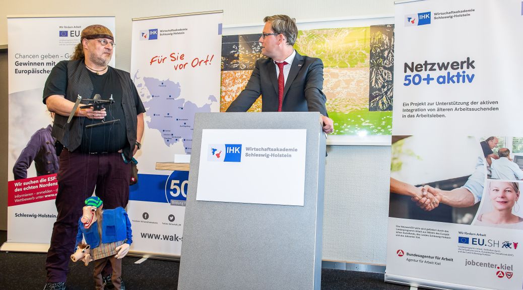 Peter Beyer ist Teilnehmer des Projekts „Leuchtturm Kiel – Gründungszentrum“. Von sich selbst sagt der 55-Jährige, er sei „unheilbar mit dem Puppentheatervirus infiziert“. Über 35 Jahre war der gelernte Tischler in Schulen und Kindergärten unterwegs und bastelte mit Kindern Marionetten aus Tetrapacks, Toilettenrollen oder Plastikflaschen. Vor vier Jahren kam dann der große Durchbruch: Für das Musikvideo zu „Lass uns gehen“ der Band Revolverheld erschuf Peter Beyer innerhalb von drei Wochen die Musiker als Marionetten – und ließ im Video die Puppen tanzen. Das brachte ihm so viel Aufmerksamkeit, dass der inzwischen arbeitslos gewordene Tischler den Sprung in die Selbstständigkeit wagte. Im ESF-Projekt „Leuchtturm Kiel“ tastete er sich gemeinsam mit seinem Coach langsam an seine geplante Selbstständigkeit heran. Denn Business- und Rentabilitätspläne oder Marktanalysen waren für den Macher Neuland, das erobert werden musste.