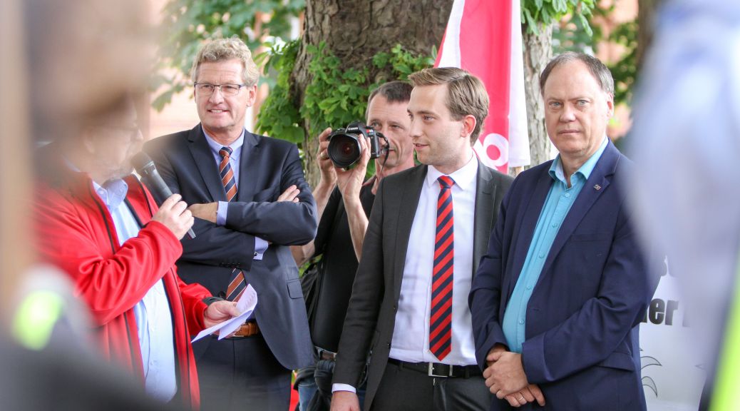 Mit einer Aktion vor dem Landtag haben der DGB und das „Bündnis eine Welt“ gegen die geplante Reform des Vergaberechts demonstriert. Busfahrer aus verschiedenen Landesteilen waren mit ihren Linienbussen nach Kiel gekommen. Insgesamt nahmen nach Angaben der Gewerkschaften rund 150 Menschen daran teil.