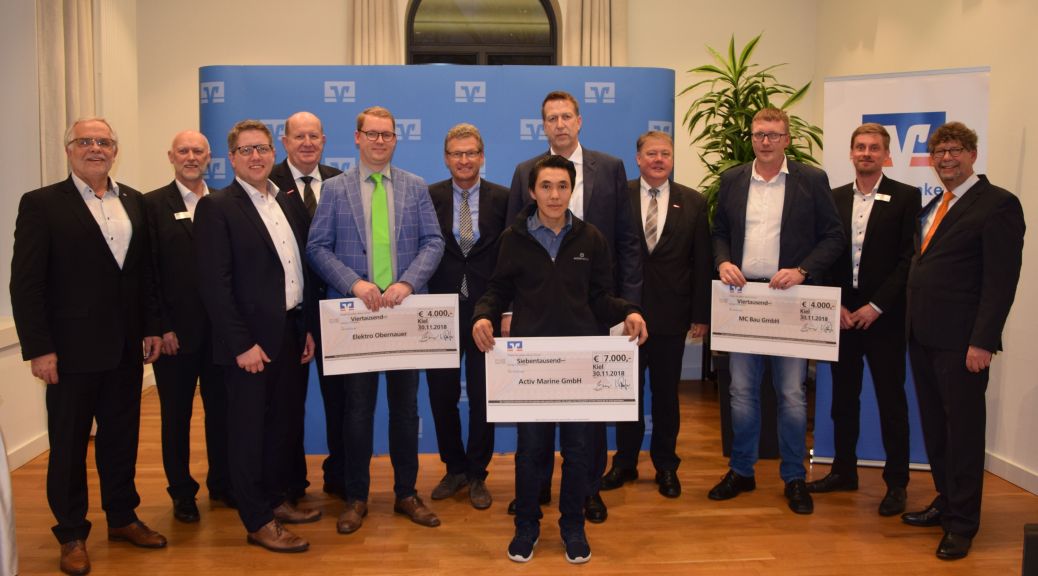 Leistungsschau des schleswig-holsteinischen Handwerks am Abend im Gästehaus der Landesregierung: Wirtschaftsminister Dr. Bernd Buchholz verlieh als Schirmherr den diesjährigen Förderpreis Handwerk der Volks- und Raiffeisenbanken. Unter den 20 Bewerbungen wählte die Jury das Flensburger Metallbau-Unternehmen „Activ Marine GmbH“ auf den mit 7.000 Euro dotierten ersten Platz. Den zweiten Platz (je 4.000 Euro) teilen sich in diesem Jahr die „MC Bau GmbH“ aus Arlewatt und Elektro Obernauer aus Ladelund (beides Nordfriesland).