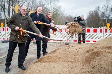 Knapp sechs Monate nach dem Startschuss zum weiteren Ausbau der B 404 zur A 21 im Kreis Plön rollen nun auch im Kreis Stormarn die Bagger an: Gemeinsam mit Gerhard Rühmkorf aus dem Bundesverkehrsministerium setzten Verkehrsminister Dr. Bernd Buchholz und der Vize-Chef des Landesbetriebs Straßenbau und Verkehr Schleswig-Holstein (LBV.SH), Frank Quirmbach, heute den Spatenstich für den weiteren dreistreifigen Ausbau der Bundesstraße im Süden des Landes.