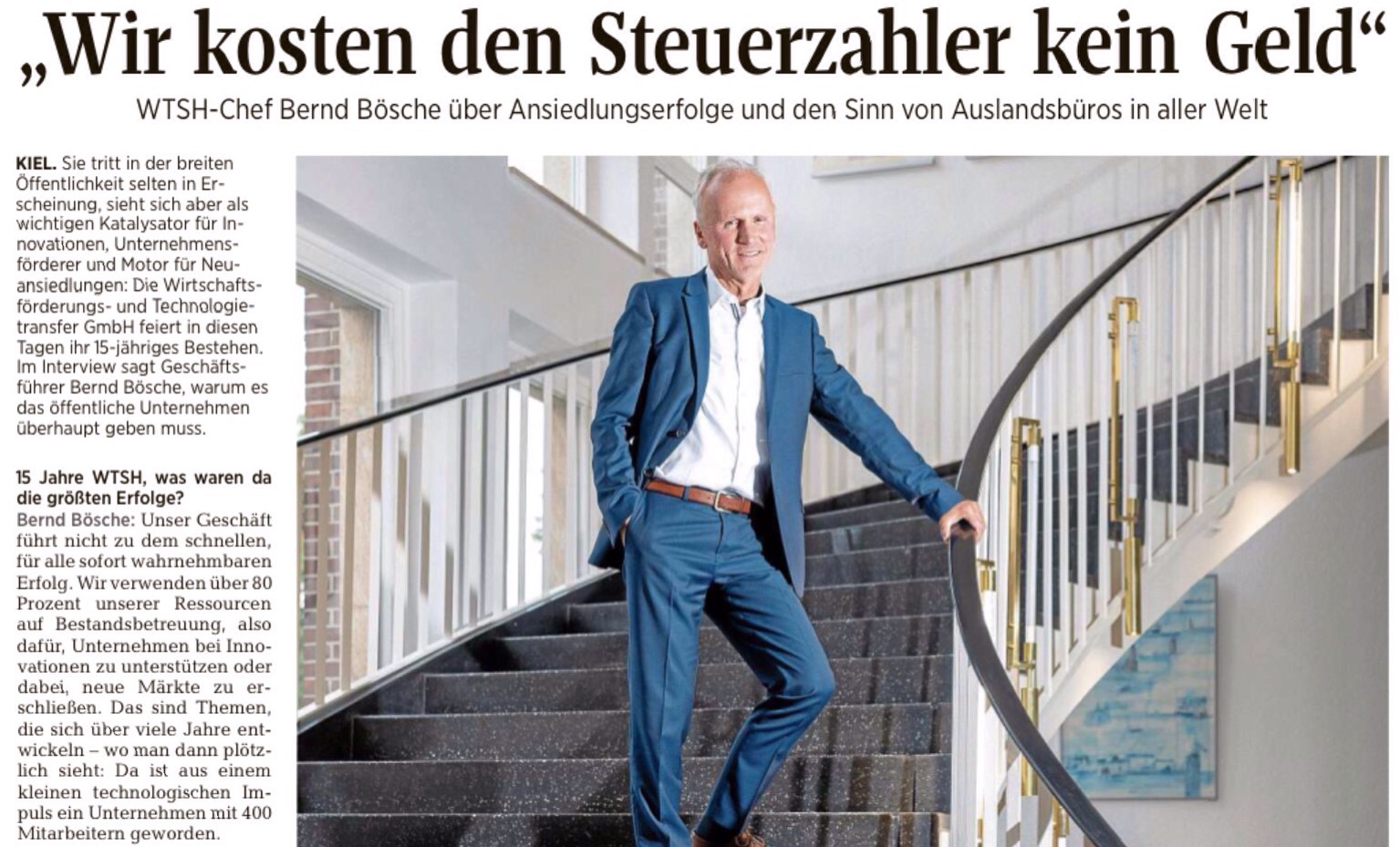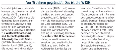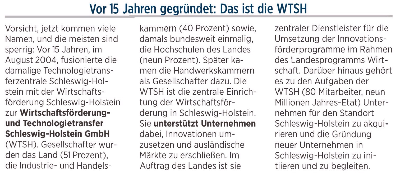 Der Name ist äußerst sperrig, die Organisation dafür aber umso wendiger, kompetenter und schlagkräftiger: Die „Wirtschaftsförderung und Technologiefransfer Schleswig Holstein GmbH“ – kurz WT.SH – feiert ihren 15. Geburtstag. Sie ist für das Land und die IHKen vor allem so etwas wie die Speerspitze der Wirtschaftsförderung im echten Norden. Wirtschaftsminister Bernd Buchholz und WT.SH-Aufsichtsratschef Thilo Rohlfs sagen: Happy Birthday!