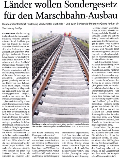 Das war knapp – aber erfolgreich: Nach einem massiven Appell von Verkehrsminister Bernd Buchholz im Bundesrat hat die Länderkammer sich soeben dafür ausgesprochen, den Ausbau der Marschbahn doch wieder auf die Liste für das so genannte Maßnahmegesetz des Bundes zu setzen. Damit besteht die Chance, dass der zweigleisige Ausbau der Strecke zwischen Niebüll und Klanxbüll beschleunigt von statten gehen kann. Der Bundestag müsste sich dafür dem Votum des Bundesrats allerdings anschließen.