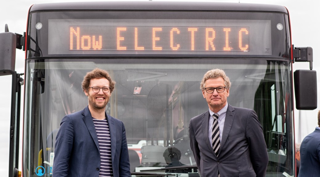 Deutschland-Premiere für einen weiteren Baustein der ökologischen Verkehrswende im echten Norden: Ab Ende des Monats rollt rund um Niebüll der bundesweit erste ÖPNV-Elektrobus. Das von den Firmen GreenTEC im nordfriesischen Enge Sande und der „I SEE Electric Busses GmbH“ umgerüstete Fahrzeug gehört der DB-Tochter Autokraft. Wirtschaftsminister Bernd Buchholz und Energiewendeminister Jan Philipp Albrecht ließen es sich nicht nehmen, heute schon mal eine kleine Probefahrt mit dem fast lautlosen Linienbus durch Kiel zu unternehmen. Das rund 800.000 Euro teure Gesamtprojekt wurde mit knapp 440.000 Euro vom Land unterstützt.