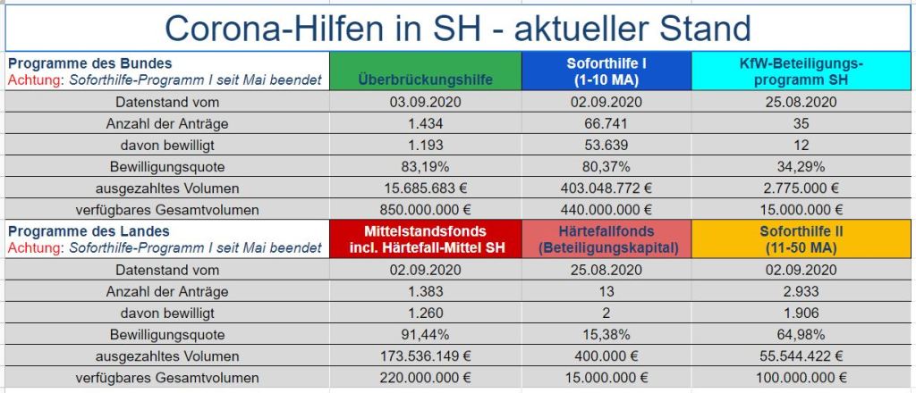 Hier ein Gesamtüberblick über die bislang in Schleswig-Holstein gewährten Corona-Hilfen: