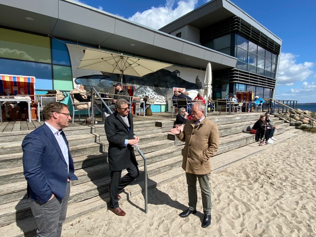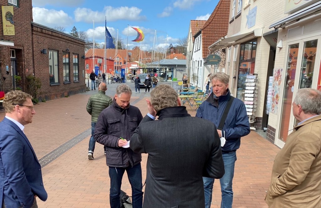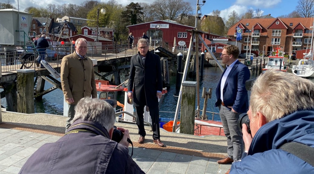 Während der Kreis Ostholstein sein Tourismus-Modellprojekt in der Lübecker Bucht mit bangen Blicken auf steigende Corona-Zahlen vorerst auf Eis legt, wagten die Verantwortlichen des Projekts in Eckernförde heute eine erste vorsichtige Start-Bilanz. Wirtschafts- und Tourismusminister Bernd Buchholz machte sich – drei Tage nach dem Start des Modellvorhabens – bei frischem Wind und strahlender Sonne selbst ein Bild. Und stellte nach einem fast dreistündigen Rundgang zufrieden fest: Mit der Auswahl von Eckernförde lagen seine Tourismusexperten richtig: „Mit 2.500 Übernachtungsbetten, 150 geöffneten gastronomischen Betrieben und 9 Testzentren vor Ort ist das Projekt ebenso überschaubar wie gut steuerbar“, so der Minister, der von Bürgermeister Jörg Sibbel und dem Geschäftsführer der Eckernförder Touristik & Marketing GmbH (ETMG), Stefan Borgmann, begleitet wurde.