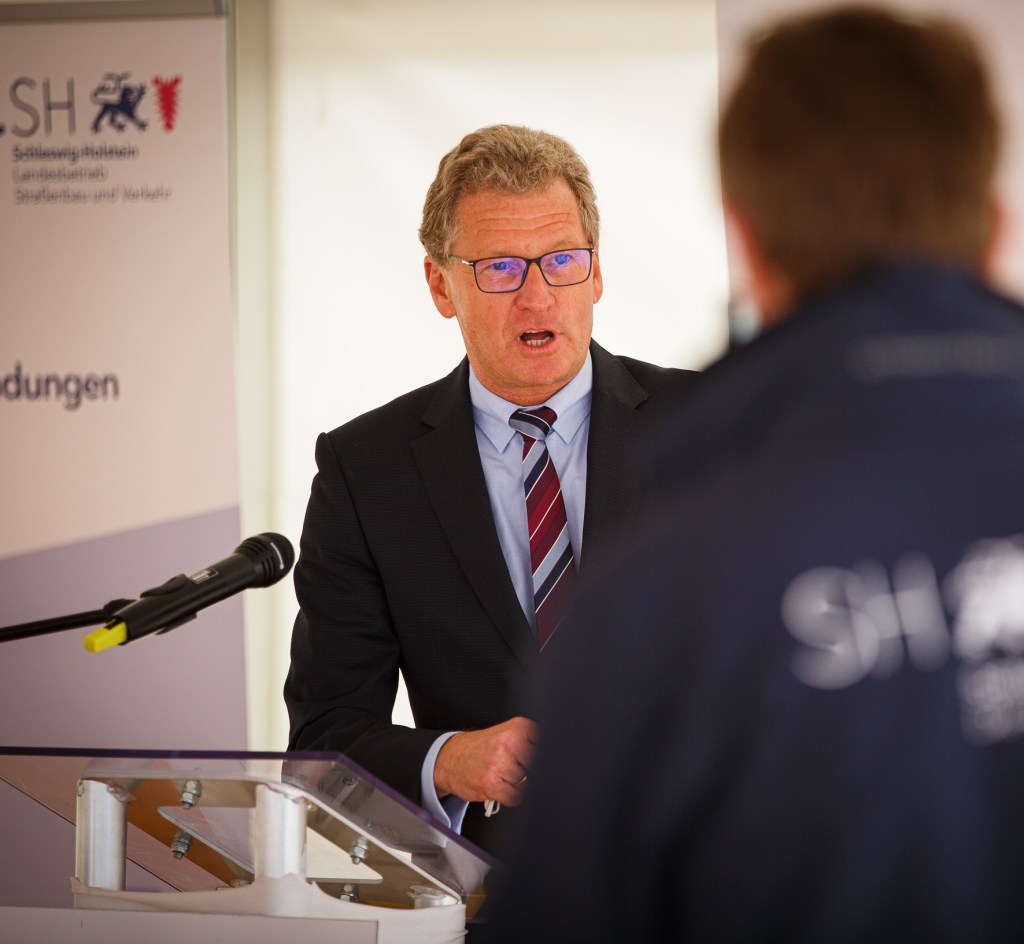 Sieben Monate nach dem ersten Spatenstich bei Husum geht der Ausbau der B 5 zwischen Tönning und Husum mit Hochdruck weiter: Enak Ferlemann, Parlamentarischer Staatssekretär beim Bundesminister für Verkehr und digitale Infrastruktur, setzte heute zusammen mit Verkehrsminister Dr. Bernd Buchholz und LBV.SH-Direktor Torsten Conradt den ersten Spatenstich für den Ausbau des Abschnitts zwischen Tönning und Rothenspieker. „Die Menschen und die Unternehmen an der Westküste warten schon viel zu lange auf die versprochene moderne und sichere Nord-Süd-Verbindung von Schleswig-Holstein und Dänemark“, sagte Buchholz.