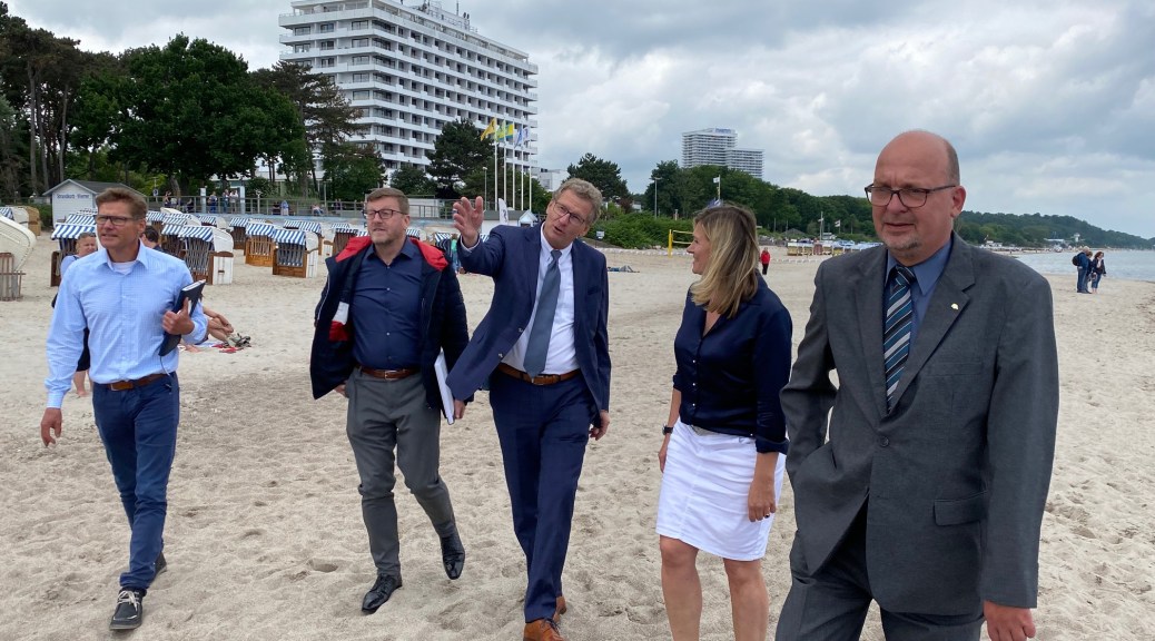 Bei seinem Besuch traf Buchholz neben dem designierten Timmendorfer Bürgermeister Sven Partheil-Böhnke und Tourismusdirektor Joachim Nitz auch mit dem OHT-Vorsitzendem Jörg Weber sowie den Hoteliers und Gastronomie-Unternehmern Mirko Stemmler (Hotel Barefoot), Christian Fitz (Cafe Fitz, Buddelbar) und Markus Bade (Strandkorb-Vermietung) zusammen. Im Mittelpunkt stand unter anderem die teilweise sinkende Akzeptanz der Tourismus-Wirtschaft in den Küsten-Hotspots. „Wir müssen schlicht anerkennen, dass die Corona-Pandemie die Akzeptanz vielerorts nicht gerade erhöht hat“, sagt Buchholz. Um die Bedürfnisse von Einheimischen, Urlaubern und Tourismus-Wirtschaft dauerhaft in Einklang zu bringen, brauche es eine Art Masterplan, der die künftige Bebauung ebenso mit Fingerspitzengefühl anpacke wie die Entwicklung einer intelligenten Besucher-Steuerung – da ist vor allem die Verwaltung gefordert, so der Minister.