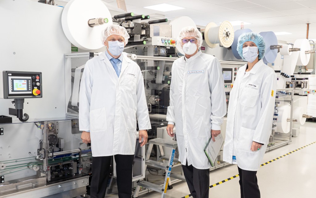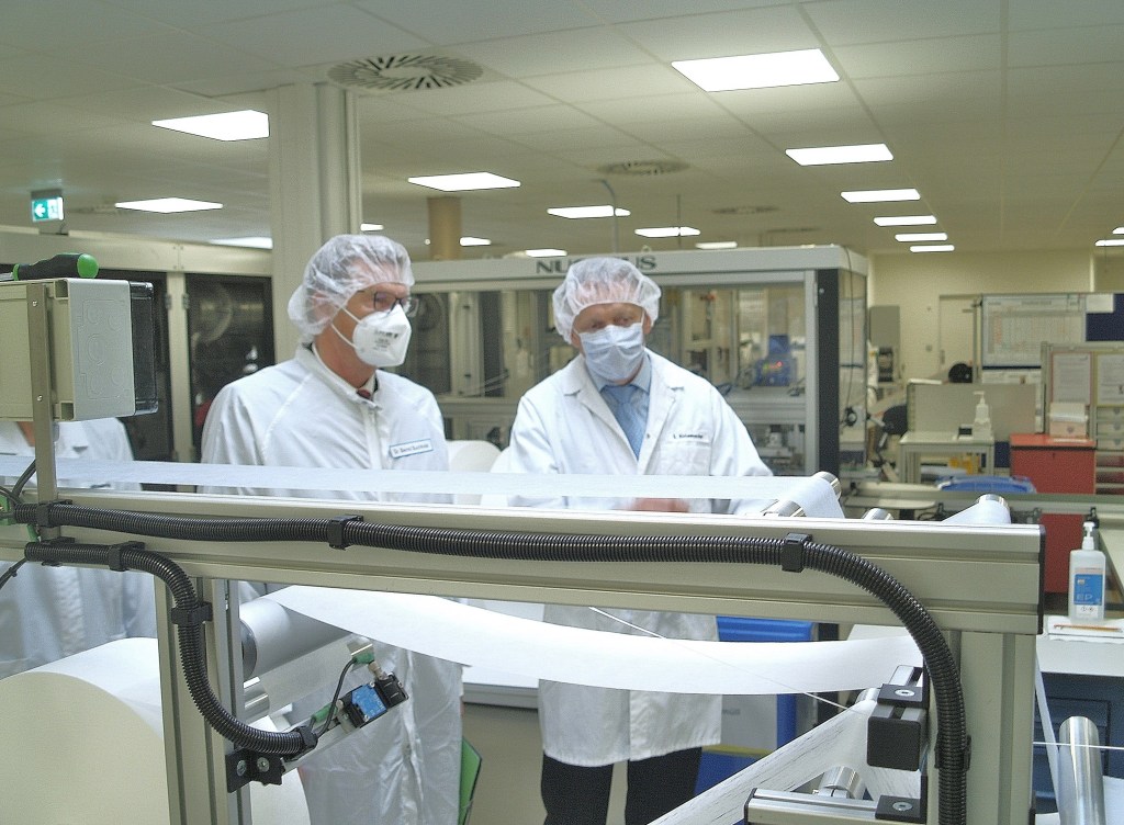 „Mit unserer OP-Maskenproduktion möchten wir einen maßgeblichen Beitrag zur Bewältigung von Pandemien – heute und in Zukunft – leisten und so Arbeitsplätze langfristig sichern“, betonte Isabel Höftmann-Toebe bei einem gemeinsamen Rundgang durch die Maskenproduktion.