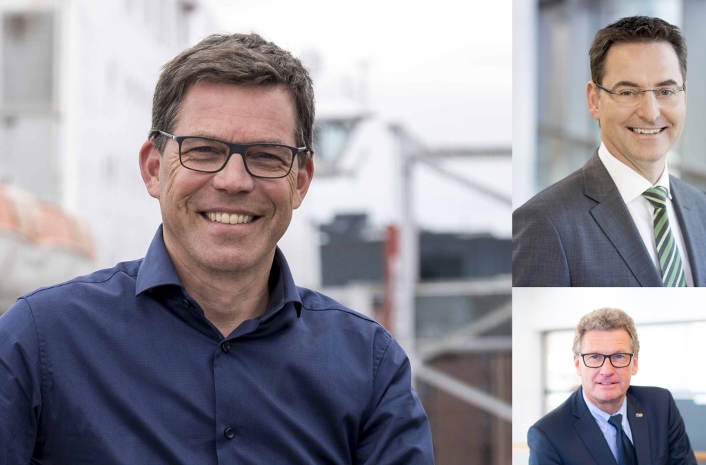 Schleswig-Holsteins Wirtschaftsminister Dr. Bernd Buchholz hat dem scheidenden Präsidenten der IHK zu Kiel, Klaus-Hinrich Vater (oben rechts), für sein langjähriges Engagement gedankt und zugleich dessen Nachfolger Knud Hansen (links) eine glückliche Hand für das Amt gewünscht. Am Abend zuvor hatte die Kammer-Vollversammlung den 54 Jahre alten Sportartikel-Händler Hansen in Kiel-Friedrichsort einstimmig zum Nachfolger von Vater gewählt. Einen Gegenkandidaten gab es nicht. Vater – der zwölf Jahre Präsident war – bleibt der IHK Kiel als Vizepräsident erhalten.
