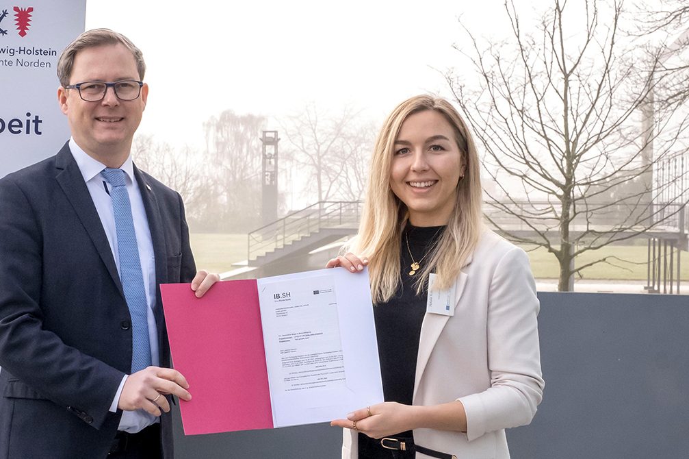 Einen Förderbescheid über knapp 500.000 Euro übergab Rohlfs an Ole Asmussen für das Rendsburger Projekt „O.Hana – Familie, Arbeit“ der Fortbildungsakademie der Wirtschaft. „O.Hana“ richtet sich an Erziehende und junge Familien und soll mit Hilfe innovativer Selbstmotivationsansätze zu einer Verbesserung der Familiensituationen der Betroffenen führen und zugleich das Thema Arbeit wieder in den Fokus rücken. Im Mittelpunkt steht unter anderem ein Bewerbungs- sowie Qualifizierungscoaching. Zudem geht es um das schrittweise Erlernen der Vereinbarkeit von Familie, Beruf oder Ausbildung.