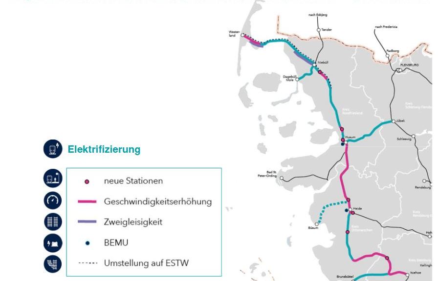 «Mit der Elektrifizierung schaffen wir die Voraussetzungen, dass zukünftige Generationen an Fernverkehrszügen umsteigefrei bis nach Sylt fahren können», sagte Nordfrieslands Landrat Florian Lorenzen. Dadurch würde bei den Fernzügen der zeitraubende Lokwechsel in Itzehoe wegfallen und die Regionalbahnen könnten von Hamburg umsteigefrei bis nach Heide fahren.