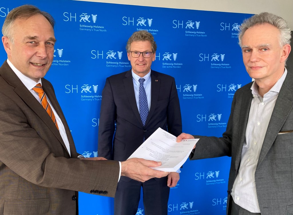 Grünes Licht des Landes für den Ausbau der AKN-Bahnlinie zur S 21 bis nach Kaltenkirchen: Das Amt für Planfeststellung Verkehr Schleswig-Holstein (APV) hat heute den 384 Seiten starken Planfeststellungsbeschluss an AKN-Geschäftsführer Ulrich Bergmann übergeben. „Damit sind wir nach fünf Jahren Planung an diesem Verkehrs-Großprojekt, bei dem sich das APV unter anderem mit über 450 Einwendungen beschäftigen musste, einen riesigen Schritt weiter“, sagte Verkehrsminister Dr. Bernd Buchholz bei der Übergabe der Unterlagen durch APV-Chef Martin Hamm. Der Beschluss samt aller Planunterlagen wird vom 7. bis zum 20. April öffentlich ausgelegt (siehe unten). Der Planfeststellungsbeschluss für den S-21-Abschnitt auf Hamburger Gebiet war bereits Ende 2018 erlassen worden.
