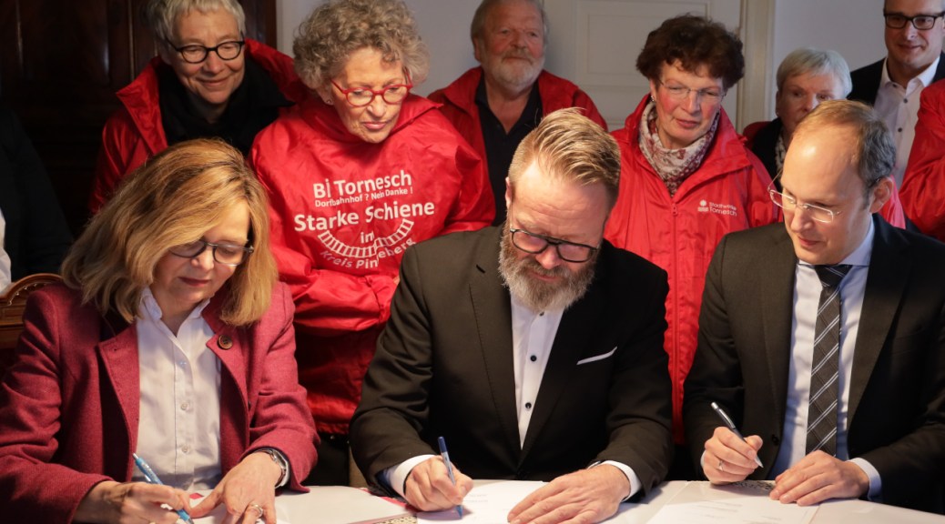 Startschuss der Planungen zum Ausbau einer der wichtigsten Bahnstrecken in Schleswig-Holstein: Verkehrsminister Claus Ruhe Madsen und Ute Plambeck, Konzernbevollmächtigte der Deutschen Bahn AG, unterzeichneten heute in Tornesch (Kreis Pinneberg) eine entsprechende Vereinbarung für das lang ersehnte dritte und vierte Gleis zwischen Pinneberg und Elmshorn.