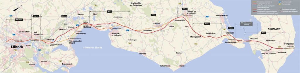 Auch die Investitionen in die Strecke selbst seien erheblich: So sei eine neue Südspange zwischen Scharbeutz und Haffkrug ebenso nötig wie der Erhalt der Bahnübergänge sowie eine vollständige Elektrifizierung der eingleisigen Strecke. «Die Forderung der Gemeinden in der Lübecker Bucht war stets, dass die Güterverkehre nicht durch die Bäderorte rollen und durch Lärm und Erschütterung deren Attraktivität gefährden. Deshalb wurde vor genau zehn Jahren nach umfassender Beteiligung der Öffentlichkeit eine Trasse gefunden, die insbesondere Timmendorfer Strand, Haffkrug und Scharbeutz umfährt. Und genau das lösen wir ein», sagte von der Heide.
