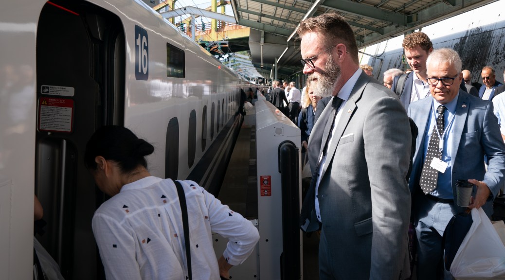 Da kann ein norddeutscher Verkehrsminister glatt neidisch werden: Rasant, komfortabel und pünktlich – das sind die Attribute des „Shinkansen“, des weltbekannten Hochgeschwindigkeitszugs (320 km/h), mit dem unsere SH-Delegation gestern zwischen Kobe und Tokyo unterwegs war. «Was Technik, Sicherheit Komfort, Sauberkeit und Service geht, wohl der tatsächlich beste Hochgeschwindigkeitszug der Welt», sagte Claus Ruhe Madsen beeindruckt. Weiter sagte er zu dem Mega-Zug – Audio starten, Pfeil klicken.