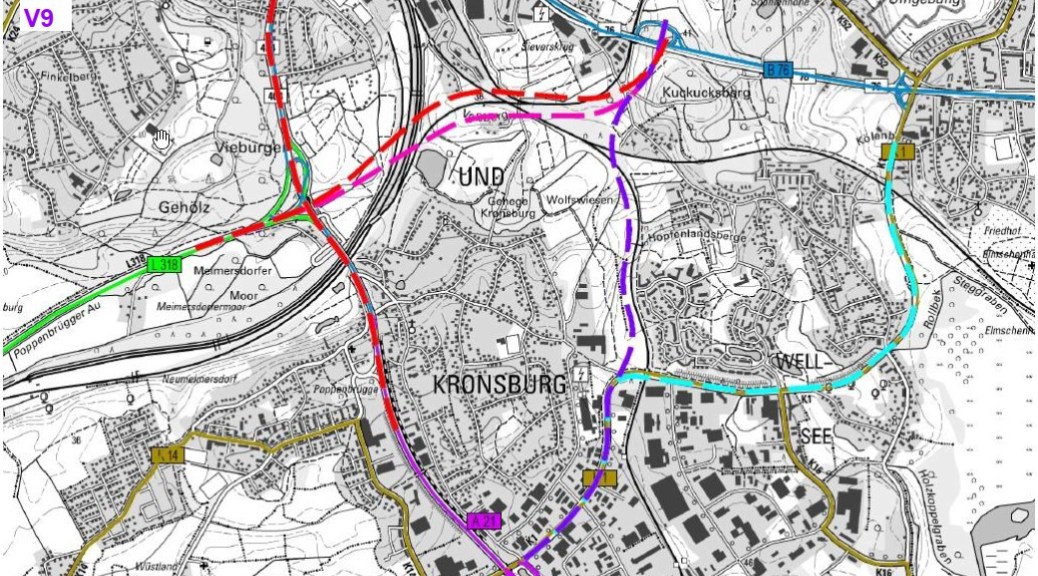 Wie Verkehrsstaatssekretär Tobias von Heide heute mitteilte, habe sich die DEGES in ihrem Gutachten damit für die dritte (in der Grafik oben V 3) von insgesamt elf Varianten als Vorzugsvariante entschieden. „Weil sich vor allem die Baukosten einer Südspange um rund 100 Millionen Euro gegenüber ursprünglichen Plänen erhöht haben, ist auch nicht auszuschließen, dass der Kosten-Nutzen-Faktor für die Südspange in der aktuellen Lage zu niedrig ist, um das Projekt zu realisieren. Gleichwohl ist der Bau der Südspange (in der Grafik V 9) zu einem späteren Zeitpunkt weiterhin möglich. Gerade in Verbindung mit dem Ostring II ist diese Maßnahme aus verkehrlicher Sicht weiterhin sinnvoll. So sieht es der Bundesverkehrswegeplan vor“, sagte von der Heide.