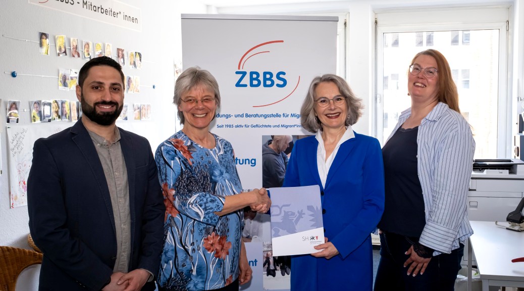 Die berufliche Integration von Geflüchteten oder Zugewanderten ermöglichen – und gleichzeitig etwas für den hohen Fachkräftebedarf in den so genannten MINT-Berufen (Mathematik, Ingenieurs- & Naturwissenschaften, Technik) tun. Das ist das Ziel eines neuen Förderprojekts des Landes, für das Arbeits-Staatssekretärin Susanne Henckel jetzt in Kiel den Startschuss gab. Für das „KBI – KompetenzBildung Informatik“ der Zentralen Bildungs- und Beratungsstelle für Migrant*innen e.V. (ZBBS) stellt das Land in den kommenden zwei Jahren knapp 330.000 Euro zur Verfügung. Einen entsprechenden Förderbescheid übergab Henckel an ZBBS-Projektleiterin Gunhild Grote (im Bild 2.v.l. neben Nabil Dabbagh, Fachlehrkraft Informatik und Personal-Geschäftsführerin Ute Afane, rechts)