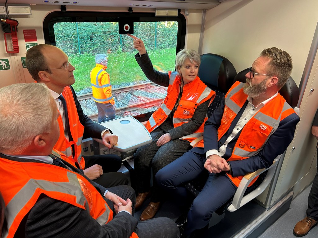 DB-Regio-Chefin Nicole Berlin in einem der modernisierten Wagen mit Minister Madsen, NAH.SH-Chef Beck (2.v.l.) und Nordfrieslands Kreispräsident Frank Zahel