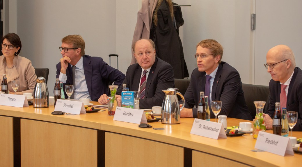 Spitzentreffen in Berlin, v.l.: Bundes-Staatssekretär Enak Ferlemann, Ministerpräsident Daniel Günther, Bundesverkehrsminister Andreas Scheuer, Hamburgs Bürgermeister Peter Tschentscher und DB-Vorstand Ronald Pofalla