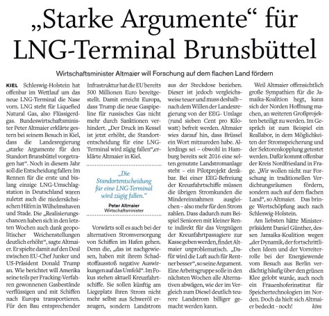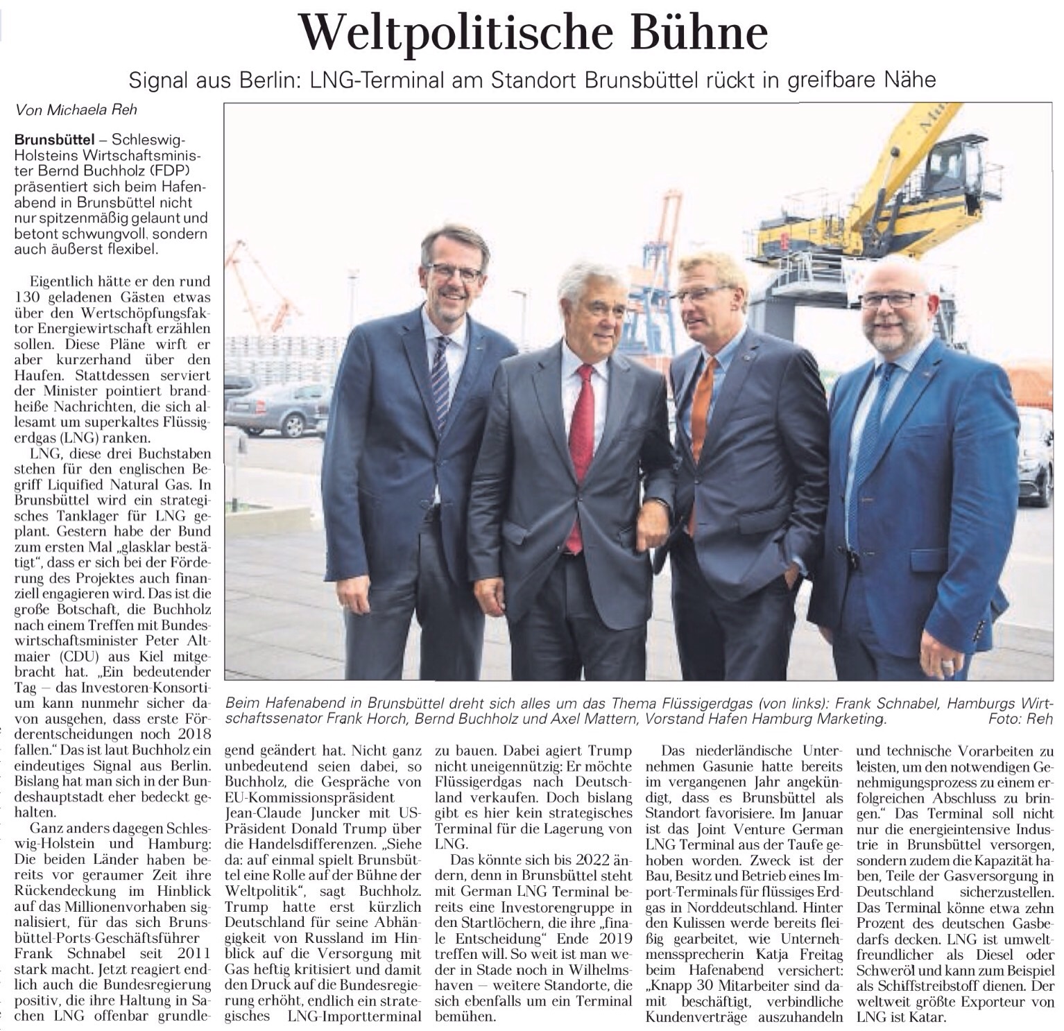 Hintergrund der veränderten Herangehensweise der Bundesregierung seien die Gespräche von EU-Kommissionspräsident Juncker mit US-Präsident Trump über die Beilegung der Handelsdifferenzen, erläuterte Buchholz. „Und siehe da: auf einmal spielt Brunsbüttel eine Rolle auf der Bühne der Weltpolitik“, ergänzte er augenzwinkernd.