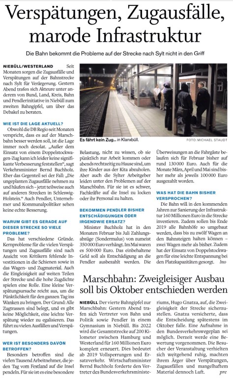 Auch Verkehrsminister Bernd Buchholz wird nach Niebüll kommen. Er erinnerte im Vorfeld der Sitzung daran, dass Bundesverkehrsminister Scheuer die andauernden Probleme auf der Bahnstrecke nach Sylt in dieser Woche ebenfalls bei der Deutschen Bahn in Berlin thematisieren will. «Ich werde das offensiv aufgreifen», hatte Scheuer am letzten Donnerstag nach einem Arbeitstreffen mit Buchholz in Flensburg erklärt. Es könne nicht sein, dass so viele Pendler, aber auch Touristen und Hotelgäste, unter den unhaltbaren Zuständen litten.