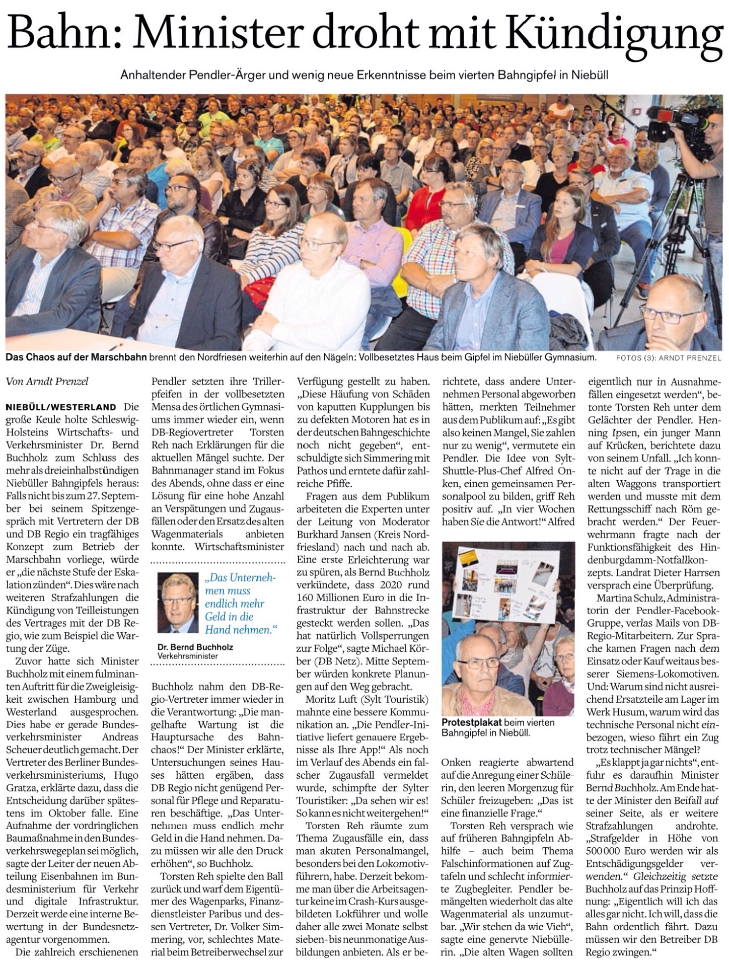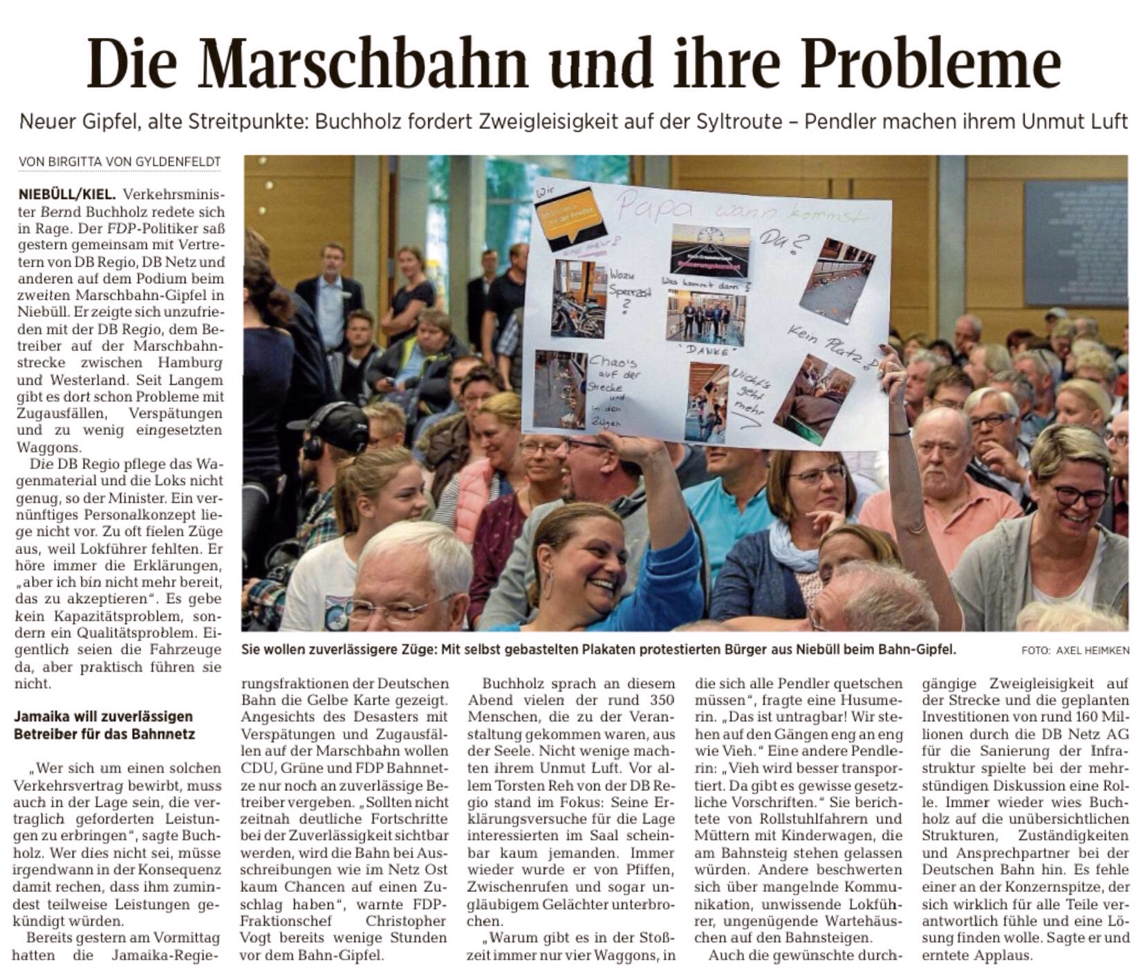 Knapp eine Woche nach dem Besuch von Bundesverkehrsminister Andreas Scheuer beschäftigt sich die Westküste heute Abend ab 19 Uhr erneut mit den nach wie vor schlechten Zuständen auf der Marschbahn-Strecke. Nordfrieslands Landrat Dieter Harrsen hat ein weiteres Mal zu einem „Bahn-Gipfel“ eingeladen, zu dem unter anderem DB-Regio-Chef Torsten Reh und andere DB-Vertreter geladen sind (siehe Vorbericht „Nordfriesland-Tageblatt“ von Sonnabend)