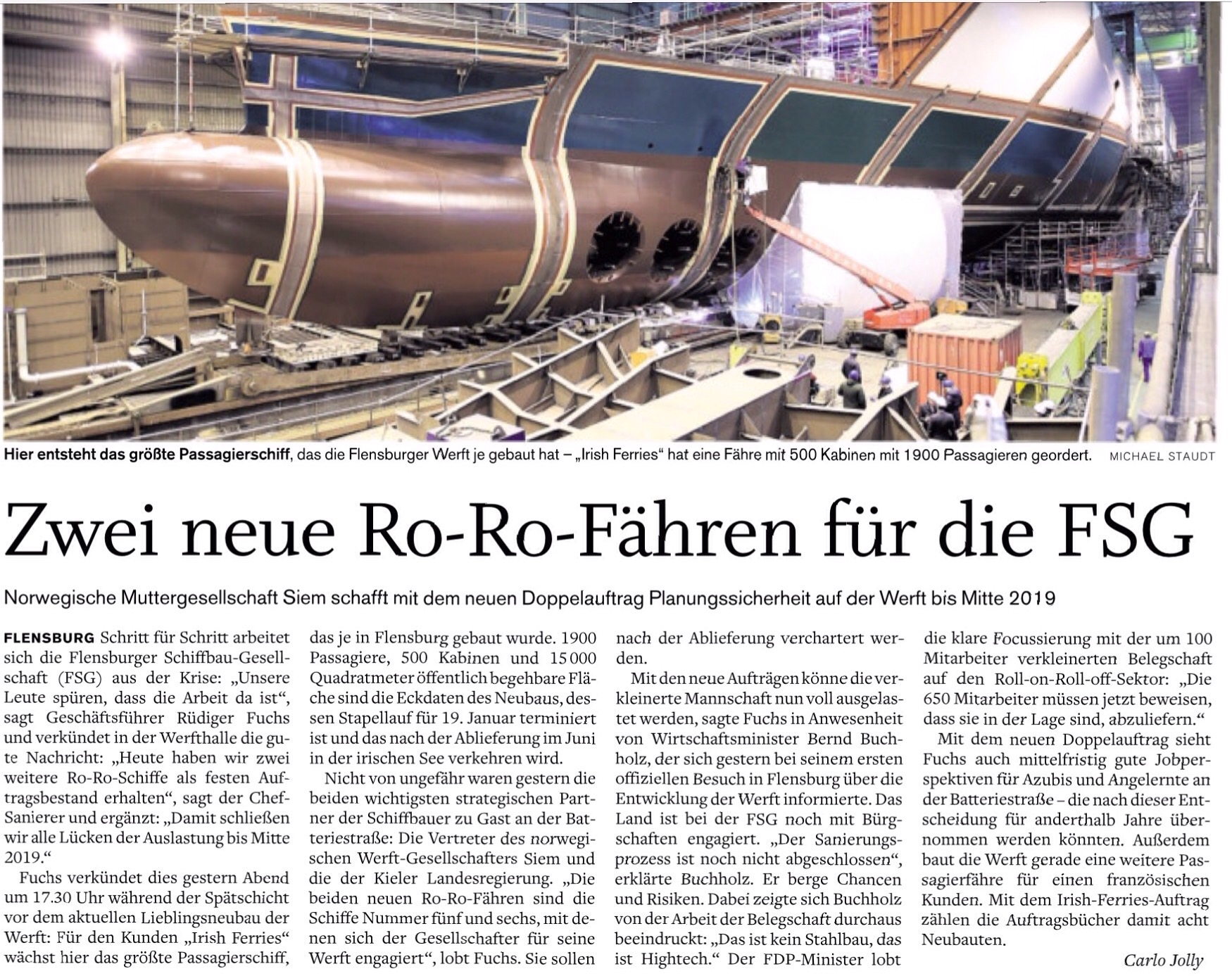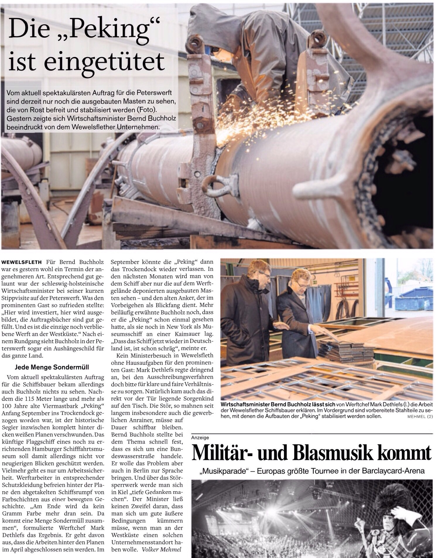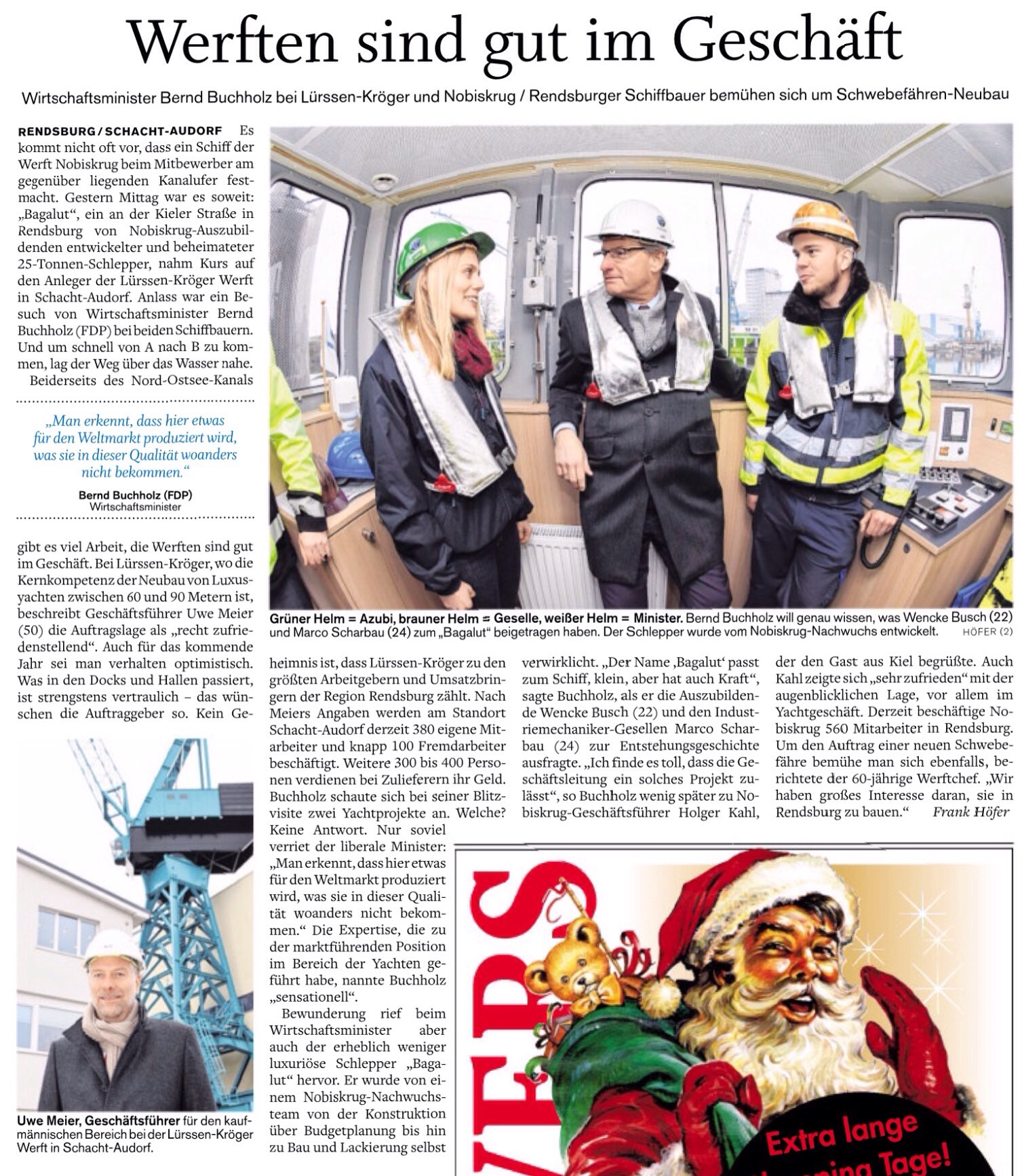 Fünf Monate nach seinem Amtsantritt hat Wirtschaftsminister Dr. Bernd Buchholz heute vier der größten Werften des Landes besucht, um sich ein eigenes Bild von der Branche zu machen. Neben dem letzten Neubaubetrieb an der Westküste, der Peters-Werft in Wewelsfleth, besuchte der FDP-Politiker die Firmen Lürssen-Kröger (Schacht-Audorf), die zu „German Naval Yards“ gehörende Rendsburger Werft Nobiskrug und die Flensburger Schiffbaugesellschaft (FSG). Bei der Kieler Werft tkms war Buchholz im Zusammenhang mit U-Boot-Großaufträgen bereits im Sommer zu Gast.