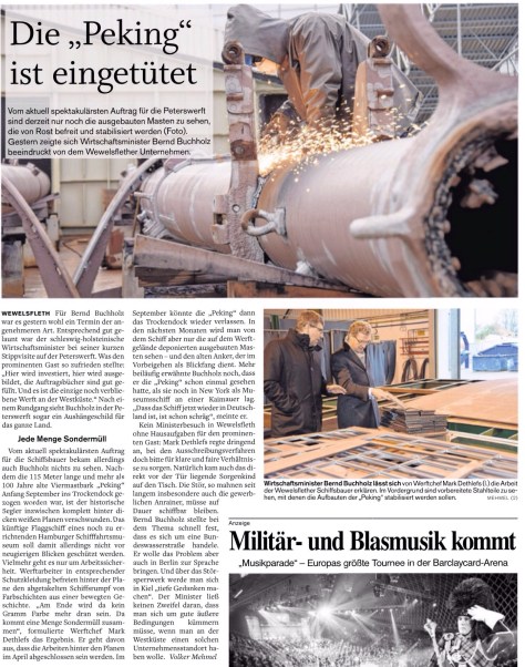 Mit Blick auf die Rolle der Werften für den gesamten Wirtschaftsstandort Schleswig-Holstein erinnerte der Minister an die starke Zulieferindustrie: „Immerhin tragen zu rund 70 Prozent der Wertschöpfung beim Bau eines modernen Schiffes die Zulieferfirmen bei.“