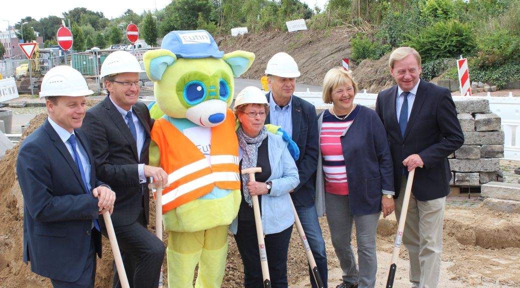 Verkehrsminister Dr. Bernd Buchholz hat heute offiziell die Bauarbeiten für einen neuen Busbahnhof (ZOB) in Eutin gestartet. Im Zuge der Sanierung der historischen Innenstadt kommt diesem Projekt gemeinsam mit dem bereits neugestalteten Bahnhofsvorplatz als Entrée zur Innenstadt eine besondere Bedeutung zu. Der ZOB wird nach den Worten von Eutins Bürgermeister Carsten Behnk komplett umgestaltet und wird sich künftig moderner und funktionaler präsentieren. Die Umgestaltung des ZOB ist der zweite Bauabschnitt der Gesamtmaßnahme „Neugestaltung Bahnhofsvorfeld-ZOB“. Die Arbeiten sind bis Juli 2018 terminiert. Nachdem bereits der Bahnhofsvorplatz in den vergangenen beiden Jahren modernisiert wurde, schließt sich der ZOB jetzt an. Die Anlage ist als teilüberdachter Mittelbussteig mit umlaufenden Sägezahn-Haltestellen mit acht Haltekanten konzipiert.