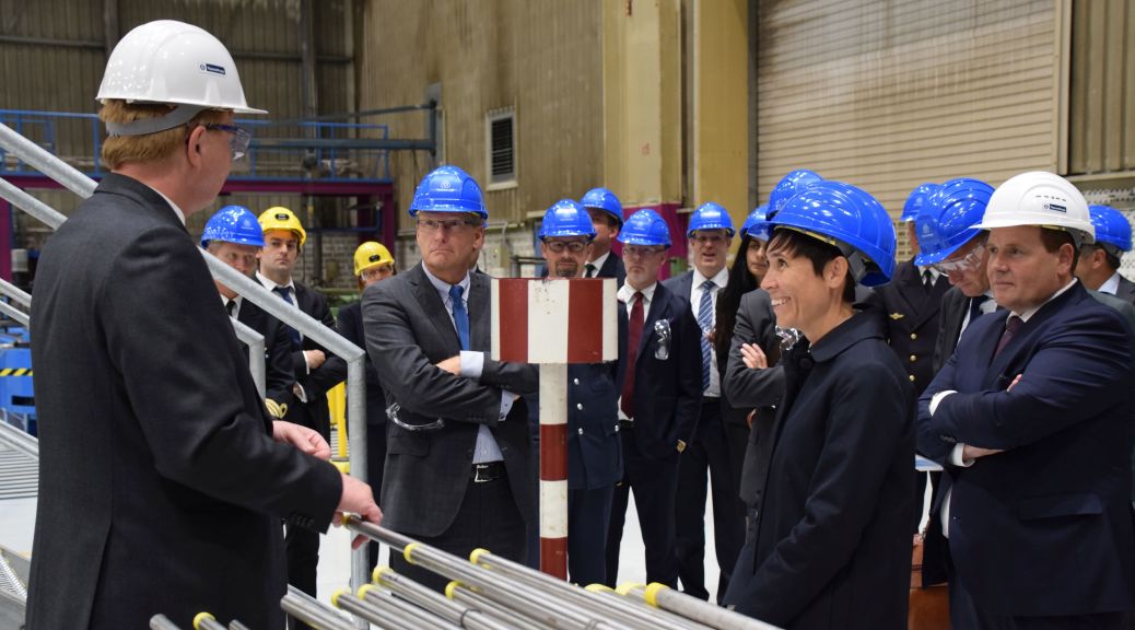 Norwegens Verteidigungsministerin Ine Marie Eriksen Søreide bei ihrem tkms-Besuch mit Minister Buchholz (links) und den Vorstands-Managern Peter Feldhaus und Andreas Burmester