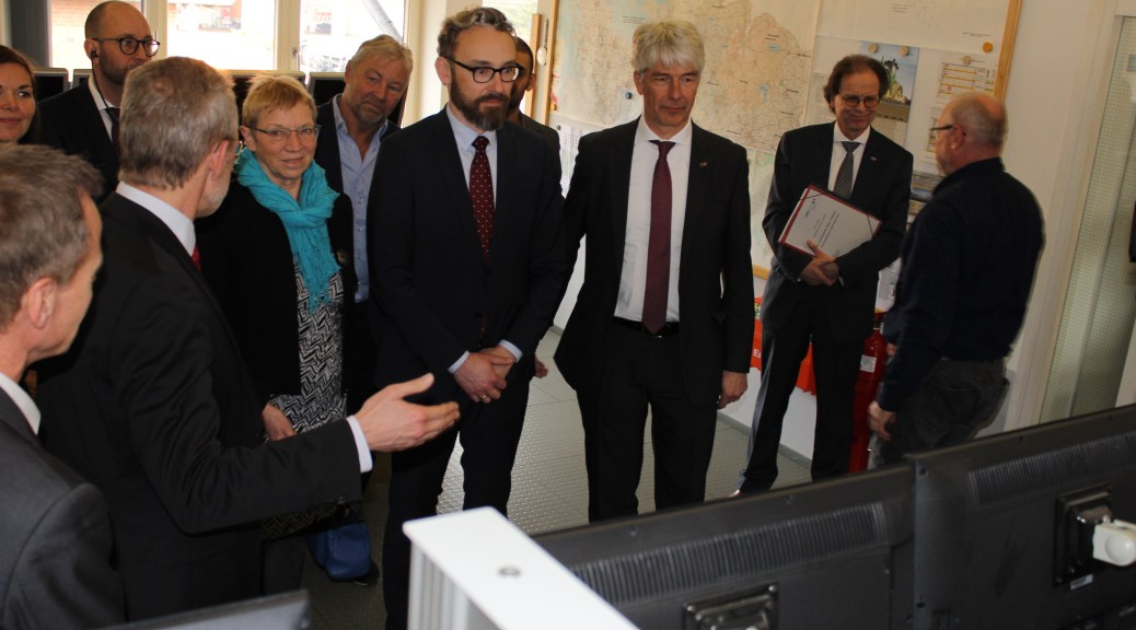 LBV-Niederlassungsleiter Matthias Paraknewitz (links) erläutert Sporendonk, Olesen und Nägele die Fernmeldemeisterei in Krogaspe bei Neumünster. Rechts im Hintergrund: LBV-SH-Direktor Torsten Conradt