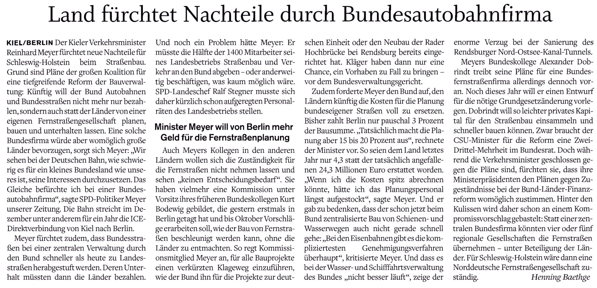 Wohin steuert der Straßenbau in Deutschland? Die Pläne von Bundesverkehrsminister Alexander Dobrindt, Autobahnen und Bundesstraßen künftig nur noch von einer neuen Bundesgesellschaft planen und bauen zu lassen, stoßen bei Landesverkehrsminister Reinhard Meyer und vielen seiner Kollegen auf Skepsis – gestern tagte in Berlin erstmals eine Länderkommission zu diesem Thema – dazu schreibt heute der sh:z