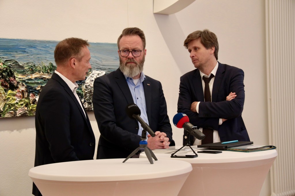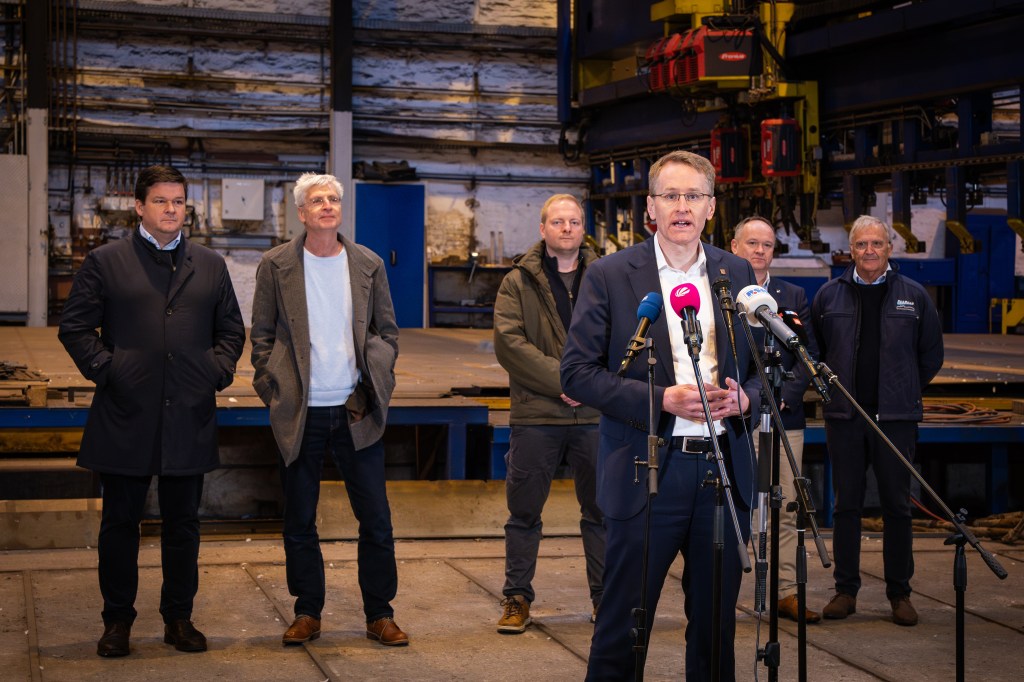 Ministerpräsident Daniel Günther mit Insolvenzverwalter Morgen (links) und Gewerkschaftsvertretern sowie neuen Eignern beim Pressegespräch