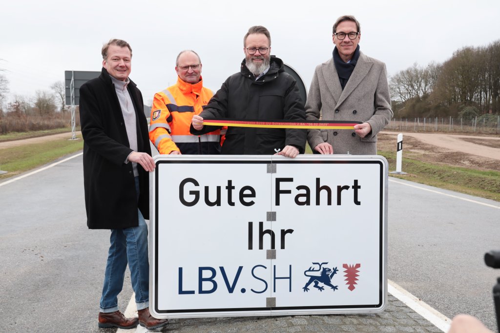 Kurz vor der feierlichen Eröffnung (v.l.): Schwarzenbeks Bürgermeister Norbert Lütjens, LBV.SH-Chef Frank Quirmbach, Minister Madsen und Frank Süsser aus dem Bundesverkehrsministerium