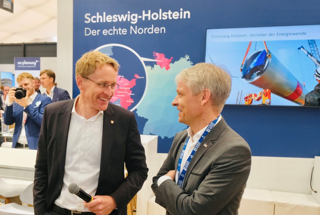 Großer Bahnhof auf der Husum Wind: Nachdem Bundeswirtschaftsminister Robert Habeck die Fachmesse offiziell eröffnet hatte, zeigten auf Einladung von Hinrich Habeck, Chef der Wirtschaftsförderung und Technologietransfer Schleswig-Holstein GmbH (WTSH), gleich drei prominente Landespolitiker Flagge: Neben Ministerpräsident Daniel Günther machten sich Wirtschaftsstaatssekretärin Julia Carstens und Energiewendestaatssekretär Joschka Knuth ein Bild der Leistungsschau um Erneuerbare Energien.