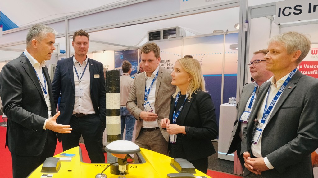 Julia Carstens mit Joschka Knuth (Mitte) und Hinrich Habeck (rechts) beim Messerundgang am Stand von NAECO Blue mit Sören Themann (links, CEO Subsea Europe Services), Felix Mertens (2.v.l., CEO NAECO Blue)