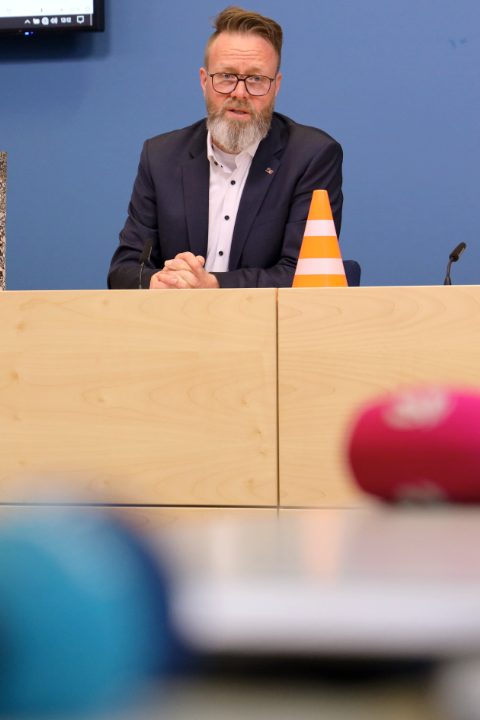 Ministerpräsident Daniel Günther heute beim Presse-Doorstep in Kiel