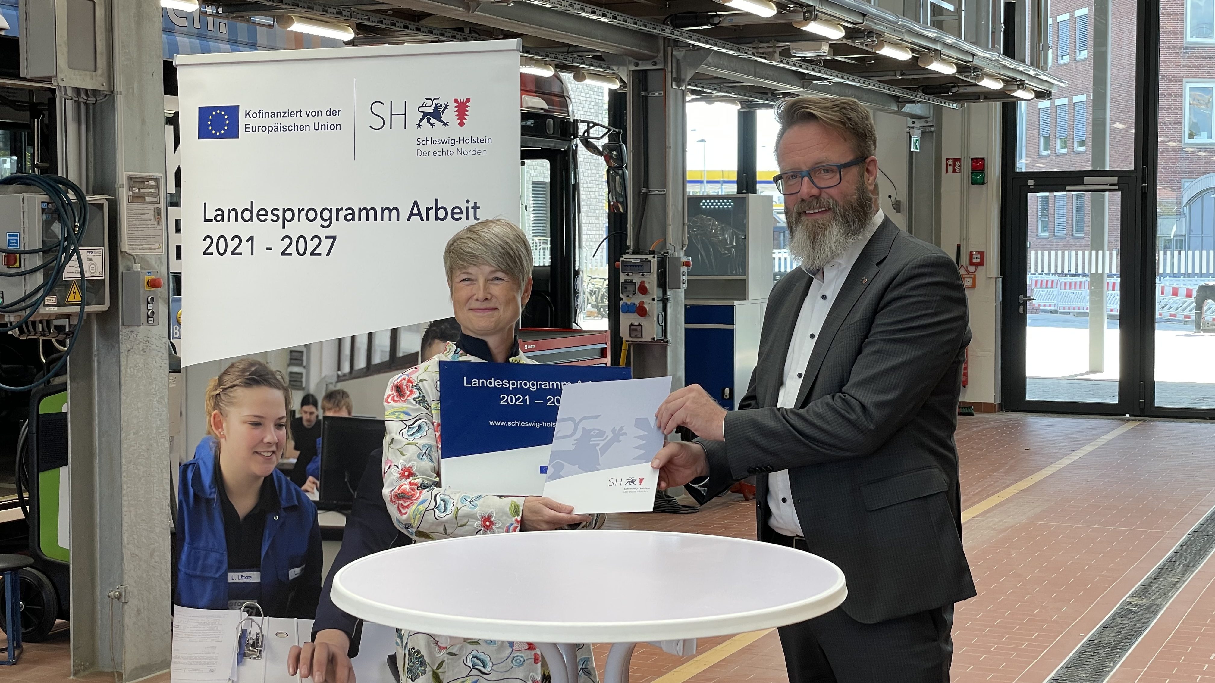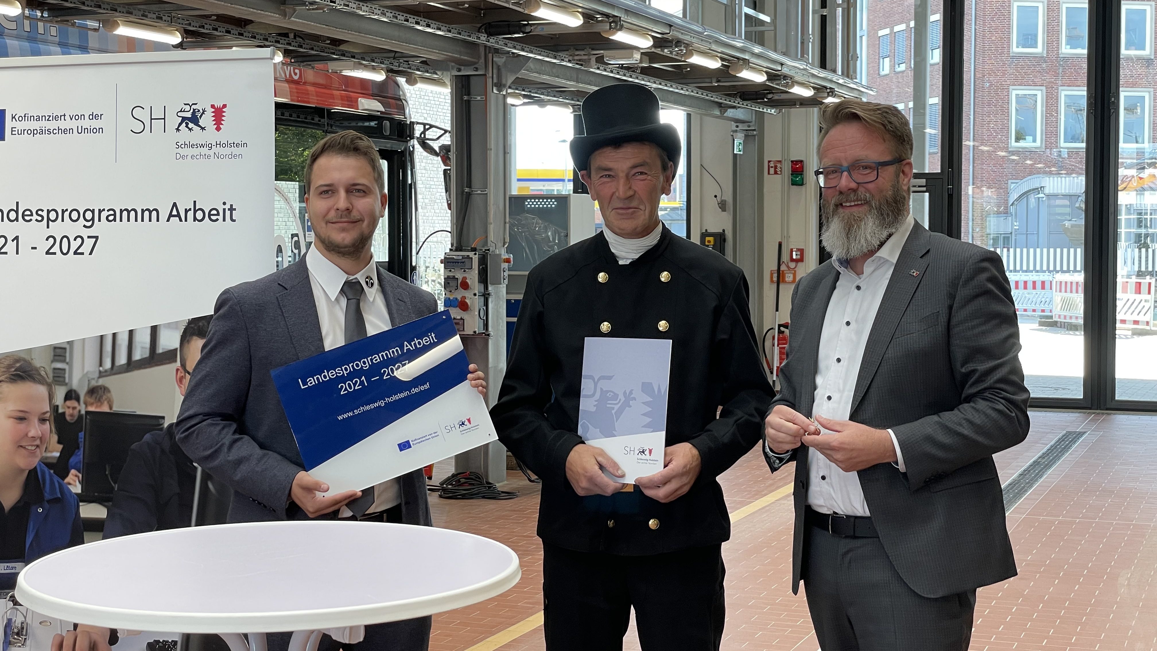 Die Bescheidübergabe fand bei der Kieler Verkehrsgesellschaft mbH (KVG) in der jüngst fertiggestellten Werkstatthalle für E-Busse statt. Hier werden elektrisch- und hybridbetriebene Busse mit modernster Technik gewartet. Von den insgesamt gut 200 Bussen im Stadtgebiet Kiel sind mittlerweile bereits die Hälfte mit Elektromobilität ausgestattet. Die KVG ist auch an dem Projekt „RENES“ (Renewable Energy New Electric Skills) der Firma OffTEC GmbH beteiligt, bei dem auch der Verband des Kfz-Gewerbes Schleswig-Holstein als Kooperationspartner fungiert.