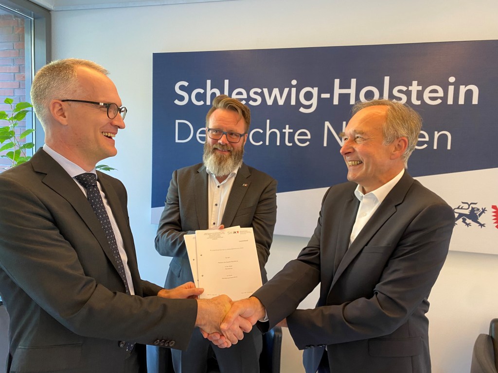 Grünes Licht für den Neubau der Instandhaltungswerkstatt des Zugherstellers Stadler in Rendsburg: Das Amt für Planfeststellung Verkehr (APV) hat heute im Beisein von Verkehrsminister Claus Ruhe Madsen den 100 Seiten starken Planfeststellungsbeschluss an Edzard Lübben, Geschäftsführer der Stadler Service Deutschland übergeben. „Damit sind wir nach 22 Monaten Verfahrensdauer dieses für die Verkehrswende wichtigen Projekts einen riesigen Schritt weiter“, sagte Madsen bei der Übergabe der Unterlagen durch APV-Chef Martin Hamm.