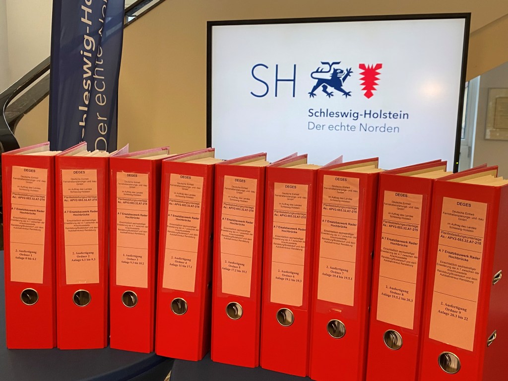 Wichtige Etappe für den Bau der neuen Rader Hochbrücke: Der Planfeststellungsbeschluss für die Zwillingsbrücke über die A7 ist fertig. Die Arbeiten an dem Bauwerk sollen 380 Millionen Euro kosten. Die Pläne für den Bau eines Ersatzes für die in die Jahre gekommene Rader Hochbrücke über den Nord-Ostsee-Kanal schreiten voran. Im Frühjahr 2023 sollen die Arbeiten für die neue Zwillingsbrücke mit sechs Fahrspuren entlang der Autobahn 7 starten.