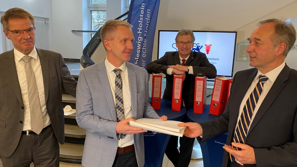 APV-Chef Martin Hamm (rechts) übergibt den 264 Seiten starken Planfeststellungsbeschluss an Carsten Butenschön von der Autobahn GmbH – links: DEGES-Chefplaner Bernd Rothe und im Hintergrund Minister Bernd Buchholz