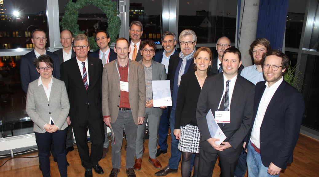 Die Sieger des landesweiten Isdeenwettbewerbs (von rechts vorn): Energiewendeminister Jan Philipp Albrecht, Prof. Dr. Christian Keindorf (Fachhochschule Kiel), Ministerin Karin Prien, Prof. Dr. Friedhelm Taube (CAU Kiel), Prof. Dr. Thomas Franke (Uni Lübeck), Prof. Dr. Hinrich Uellendahl (Uni Flensburg), Minister Buchholz, Dr. Sandra Hansen (CAU Kiel).