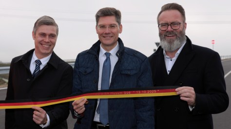 Landrat Florian Lorenzen, Staatssekretär Hirte und Minister Madsen auf dem neuen B-5-Teilstück südlich von Husum