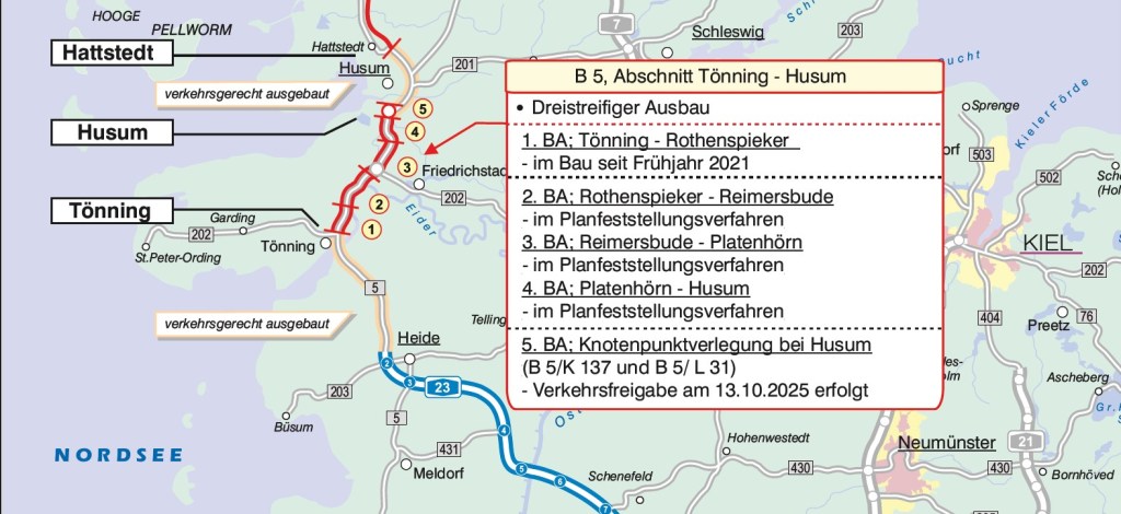 Bundesstaatssekretär Hirte erinnerte daran, dass es sich bei der Anschlussstelle um einen wichtigen Teil des rund 200 Millionen Euro umfassenden Gesamtausbaus der B 5 zwischen Husum und Tönning handelt: „Die B 5 ist innerhalb Deutschlands eine der ganz zentralen touristischen Routen in Richtung Nordseebäder und zu den Nordfriesischen Inseln. Der Verkehr wird hier laut Prognosen weiter zunehmen“, so Hirte. Umso erfreulicher sei es, dass sich das Projekt gut im Zeitplan befinde. Aktuell laufen seit 2021 die Bauarbeiten auf dem 5,7 Kilometer langen Teilstück zwischen Tönning und Rothenspieker – die Fertigstellung ist für den Jahreswechsel 2026/2027 vorgesehen.
